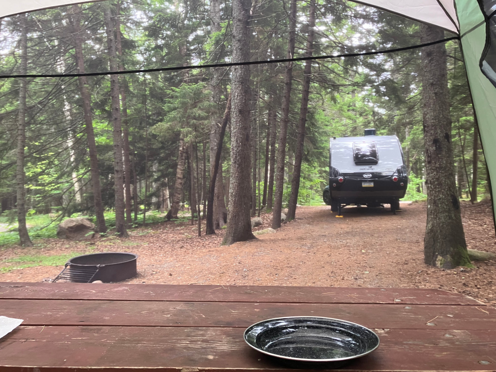 We arrived at Blackwoods Campground in Acadia National Park around 6 PM, made a stop at the dump station, and then went to find site A-65. This is a long, narrow, back-in site that sits at an acute angle to the road. I failed twice at backing in, then realized that I had to pull well past the site and then barely turn the trailer. Trees on either side of the driveway caused me some worry, but with my wife on the walkie-talkie giving guidance, it all worked out.