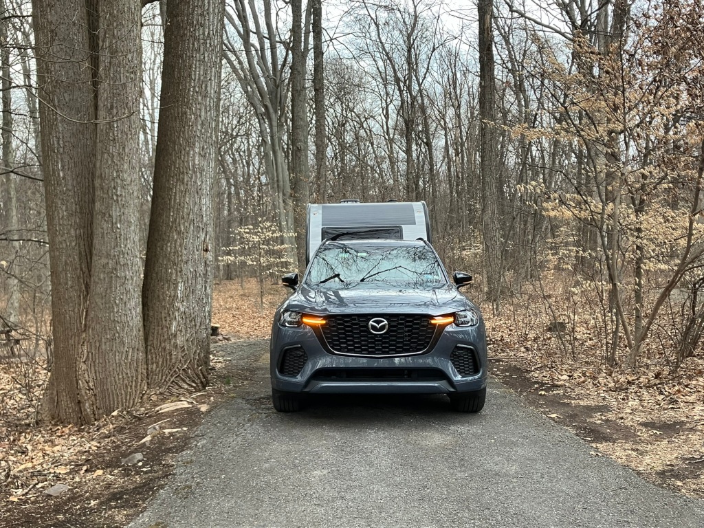 For 5,000 pounds capacity and “not a truck” I was looking at “midsize” SUVs (I always thought the Outback was midsize, but apparently not). I considered the Subaru Ascent (an Outback on steroids, not that attractive, and it only has a four-cylinder engine), the Ford Explorer ST (lots of power, integrated trailer brake controller, but the inside is decidedly plasticky), and the Honda Passport (checked most of my boxes, but towing is an add-on). And then, reading a comparison of midsize SUVs, I learned about the Mazda CX-90 and its soon-to-be-released near-identical twin, the two-row CX-70.