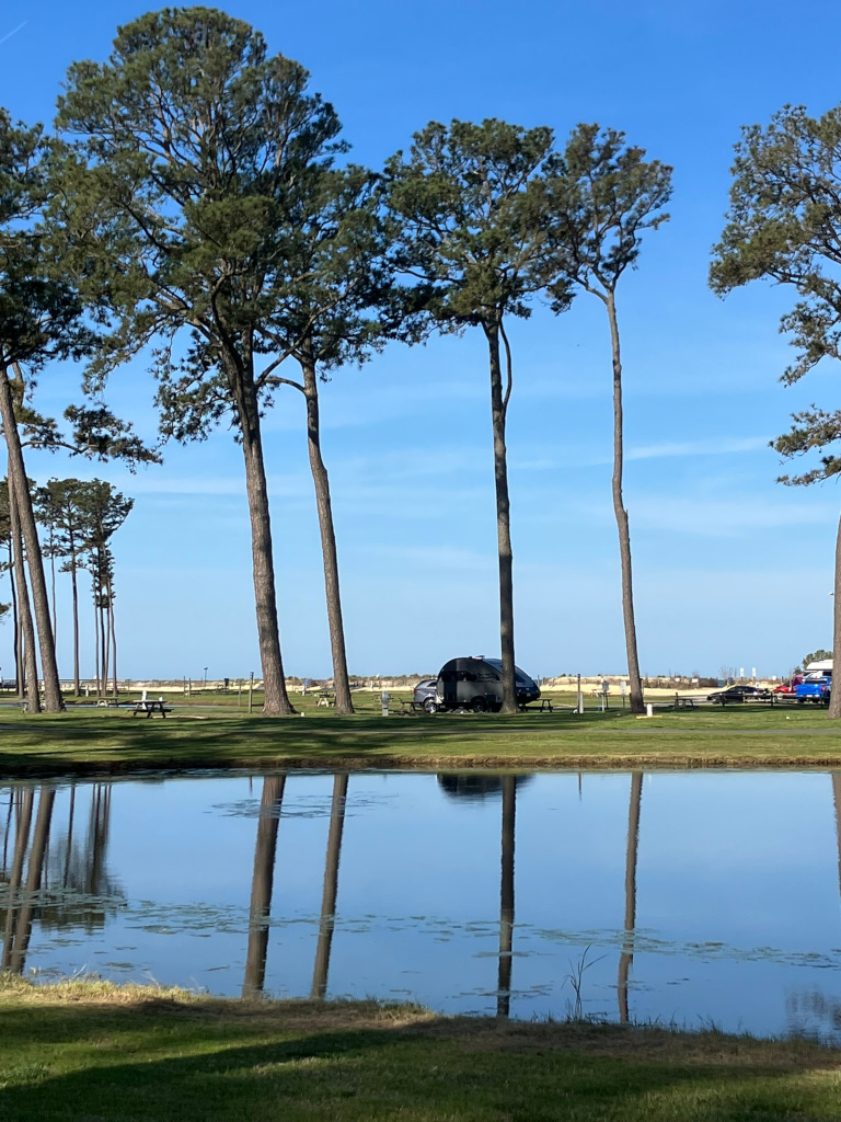 This was our first multi-day dry camping experience, albeit only for two days. We had a full tank of fresh water that we'd brought from Philadelphia, and I'd emptied the gray at Sun Outdoors (although not completely, I think), but the black tank already had two days of usage. We ate dinner and breakfast at the site both days, with associated dishwashing, but didn't take any showers (I used the campground shower, which was a bracing experience). When we left, the black and gray were both showing 2/3 full, and the fresh was — possibly due to an uneven surface — showing only 1/3. Fortunately, our next stop was a full-hookup site at OBX Campground, a small commercial campground just outside Kitty Hawk.